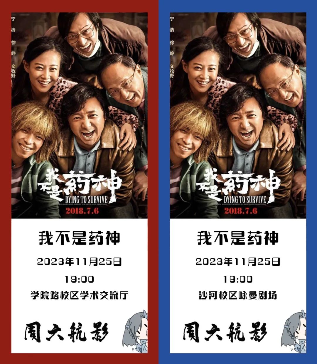 11月25日(周六)19:00,《我不是藥神》將于學院路校區(qū)學術交流廳和沙河校區(qū)詠曼劇場同步放映。