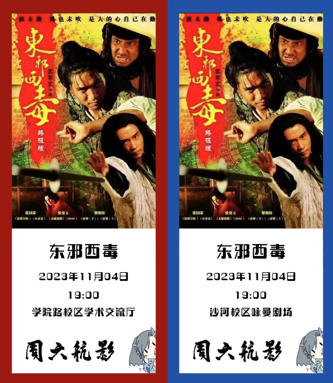 11月4日(周六)19:00,《東邪西毒》將于學(xué)院路校區(qū)學(xué)術(shù)交流廳和沙河校區(qū)詠曼劇場(chǎng)同步放映!