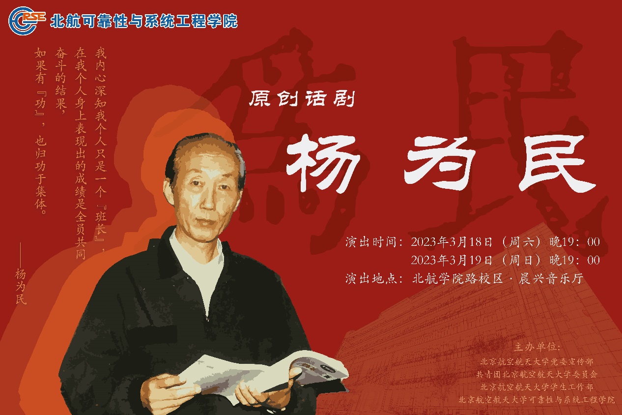 3月18日、19日晚19:00,學院路校區晨興音樂廳,讓我們一起共賞話劇《楊為民》,一起走近這位北航的脊梁,這位中國可靠性事業的開拓者和奠基人。