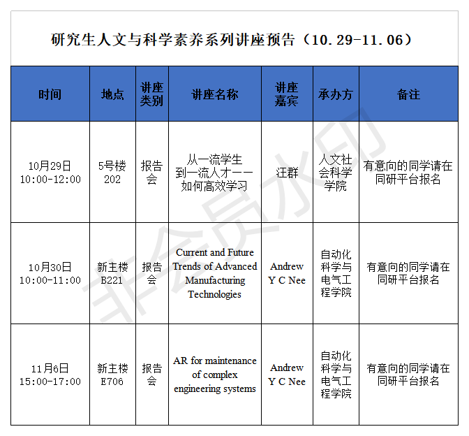 為提升我校研究生文化素養(yǎng),培養(yǎng)研究生科學(xué)精神,促進研究生學(xué)術(shù)交流,營造具有傳統(tǒng)與時代結(jié)合、人文與科學(xué)融合的研究生創(chuàng)新文化,黨委研究生工作部于2016年3月啟動我校研究生人文與科學(xué)素養(yǎng)提升平臺建設(shè)。每周在校園網(wǎng)和研究生院官網(wǎng)上對近期即將舉行的人文與科學(xué)素養(yǎng)講座、報告或相關(guān)活動進行預(yù)告,歡迎感興趣的同學(xué)積極參與。