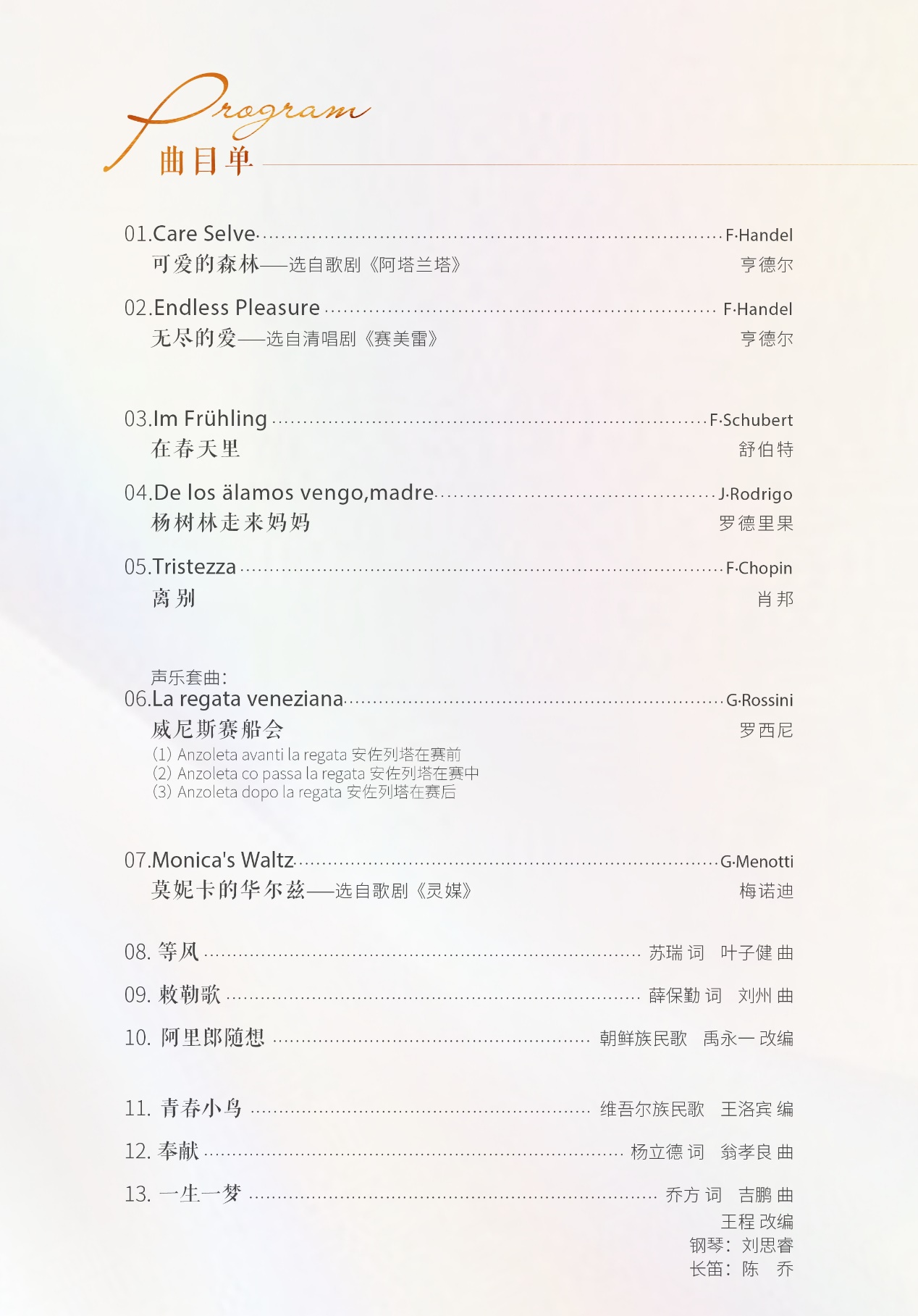 作為優(yōu)秀的聲樂(lè)鋼琴伴奏家,具有嫻熟的演奏技巧和豐富的作品積累,多年來(lái)曾受邀與吳碧霞、郭森、石倚潔、DENYCE GRAVES等眾多國(guó)內(nèi)外著名歌唱家合作演出。