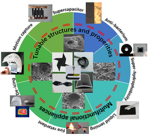 通過系統(tǒng)的加工結(jié)構(gòu)性能關(guān)系探索研究,該先進(jìn)激光誘導(dǎo)GP材料具備優(yōu)異的力學(xué)、電學(xué)、熱學(xué)、電化學(xué)等特性,可用于可穿戴手勢(shì)識(shí)別、機(jī)器人動(dòng)作捕捉、油水分離、抗菌界面以及實(shí)現(xiàn)具有阻燃、防/除冰、結(jié)構(gòu)健康監(jiān)測(cè)等功能的先進(jìn)航空樹脂基復(fù)合材料結(jié)構(gòu),未來具有廣闊的商業(yè)化前景。
